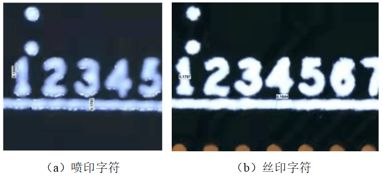 另外,由于噴印油墨極低粘度的特點(diǎn),在油墨組分上同絲印油墨差異很大,表現(xiàn)在PCB基材上的白度和立體感往往會(huì)比現(xiàn)有絲印油墨要顯得弱一些,有時(shí)就會(huì)覺得相同厚度和大小字符下絲印字符可能會(huì)更清楚,但是由于噴印墨水的流平性會(huì)好一些,所以噴印字符會(huì)覺得更光滑點(diǎn)。這里應(yīng)該堅(jiān)持以IPC字符標(biāo)準(zhǔn)——目視清晰可辨——為依據(jù)來判斷字符質(zhì)量是否符合要求,不能強(qiáng)求噴印和絲印完全一致。